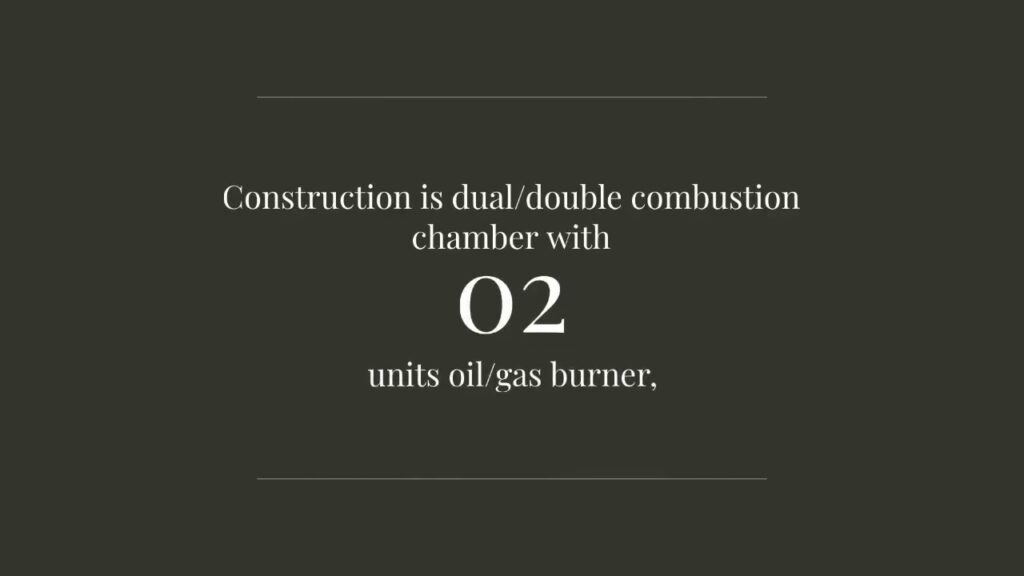 Combustion Chamber: · Horizontal cylindrical design · Inner surface carried out with first-rate refractory material, high temperature proof, · Combustion chamber volume; 5,3 approximately. · 1 No. loading door set on the frontal edge of the burning chamber, having a whole section crossing, suitable to load the Hospital waste material and to unload the ashes. ...