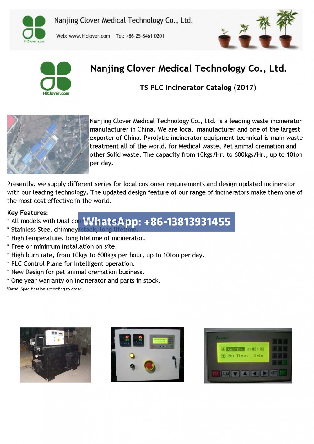 Items/Model TS10(PLC) TS20(PLC) TS30(PLC) TS50(PLC) TS100(PLC) Burn Rate (Average) 10 kg/hour 20 kg/hour 30 kg/hour 50 kg/hour 100 kg/hour Feed Capacity(Average) 20kg 40kg 60kg 100kg 200 kg Control Mode PLC PLC PLC PLC PLC Combustion Chamber 100L 210L 330L 560L 1200L Internal Dimensions 50x50x40cm 65x65x50cm 75x75x60cm 100x80x70cm 120x100x100cm Secondary Chamber 50L 110L 180L 280L 600L Smoke Filter Chamber Yes Yes Yes Yes Yes Feed Mode Manual Manual Manual Manual Manual Voltage 220V 220V 220V 220V 220V Power 0.5Kw 0.5Kw 0.5Kw 0.7Kw 0.7Kw Oil Consumption (kg/hour) 5.4–12.6 7.8–16.3 10.2–20 12.1–24 14–28 Gas Consumption (m3/hour) 6.2–11.4 8–15.7 9.8–20 9.9–26.1 10–32.2 Temperature Monitor Yes Yes Yes Yes Yes Temperature Protection Yes Yes Yes Yes Yes Oil Tank 100L 100L 100L 100L 200L Feed Door 30x30cm 45x40cm 55x50cm 70x55cm 80x60cm Chimney 3Meter 3Meter 5Meter 5Meter 10Meter Chimney Type Stainless Steel Stainless Steel Stainless Steel Stainless Steel Stainless Steel 1st. Chamber Temperature 800℃–1000℃ 800℃–1000℃ 800℃–1000℃ 800℃–1000℃ 800℃–1000℃ 2nd. Chamber Temperature 1000℃-1200℃ 1000℃-1200℃ 1000℃-1200℃ 1000℃-1200℃ 1000℃-1200℃ Residency Time 2.0 Sec. 2.0 Sec. 2.0 Sec. 2.0 Sec. 2.0 Sec. Gross Weight 1500kg 2200kg 3000kg 4500kg 6000kg External Dimensions 140x90x120cm 160x110x130cm 175x120x140cm 230x130x155cm 260x150x180cm